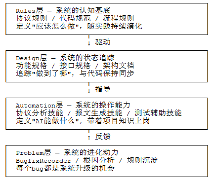 这四层的关系不是线性的——Rules驱动Design,Design指导Automation,但Problem层的反馈又会回溯更新Rules。这是一个自增强的循环:问题越多,规则越完善;规则越完善,同类问题越少;新的问题又会催生新的规则。